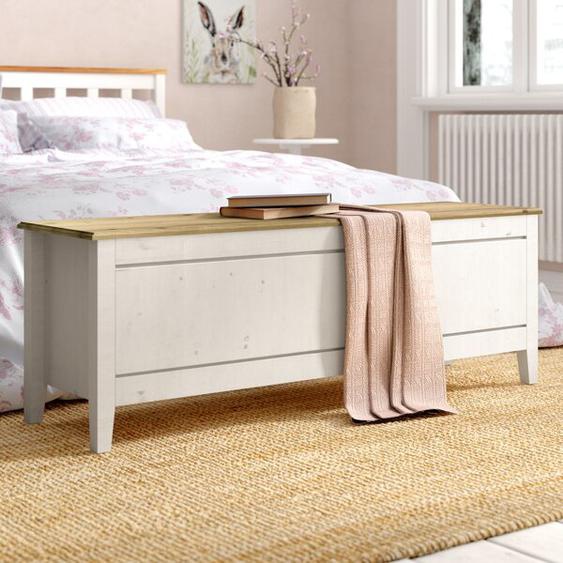 Praktischen stauraum bietet eine sitztruhe im schlafzimmer.